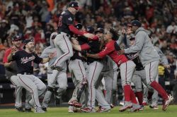 HOUSTON (AP) – Washington has a World Series championship for the first time since the 1924 Senators beat the New York Giants. Anthony Rendon and Howie Kendrick belted huge home runs in the seventh inning as the Nationals rallied to take Game 7, 6-2 over the Astros in Houston. Winning pitcher Patrick Corbin gave the Nats three solid innings of shutout relief to close out a series in which the road team won every game. Astros starter Zack Greinke cruised through the first 6 1/3 innings, allowing just one hit and one walk until the dam burst. Rendon belted a solo homer got the Nationals within 2-1 before Howie Kendrick slammed a two-run blast off reliever Will Harris two batters later. It was yet another big postseason hit for Kendrick, who was the MVP of the NL Championship Series after slamming a tiebreaking grand slam in extra innings to give the Nats the fifth and deciding game of the division series against the Dodgers. Juan Soto doubled Washington’s lead with an RBI single in the eighth, one inning before Adam Eaton’s two-run single put the Nats in complete control. Houston managed just two of their nine hits after Washington starter Max Scherzer left the game. Scherzer needed 103 pitches to complete his five innings of work, yielding seven hits and four walks but just two runs. The three-time Cy Young Award winner made a quick recovery after being scratched from Game 5 due to a nerve irritation near his neck. It’s the first World Series crown for the Nationals in franchise history, including their time as the Montreal Expos from 1969 through 2004. The Nats had never won a playoff series before this year. Their playoff run occurred despite a 19-31 start to the campaign. Yuli Gurriel hit a solo homer for the Astros, who were seeking their second championship in three seasons. Stephen Strasburg was named the MVP of the series after going 2-0 with a 2.51 ERA. Strasburg was outstanding in helping the Nationals win Game 6 and extending the Fall Classic to the limit.