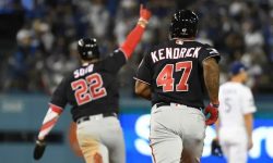 LOS ANGELES (AP) – Howie Kendrick hit a tiebreaking grand slam off Joe Kelly in the 10th inning, and the Washington Nationals overcame a three-run deficit with a late rally to beat the Los Angeles Dodgers 7-3 Wednesday night and advance to the NL Championship Series against St. Louis. Three-time Cy Young Award winner Clayton Kershaw blew a 3-1 lead by allowing homers to Anthony Rendon and Juan Soto on consecutive pitches in the eighth. The wild-card Nationals open the NLCS at St. Louis on Friday night. The seven-time defending NL West champion Dodgers, who led the NL with 106 wins, remain without a World Series title since 1988. Adam Eaton walked against Kelly leading off the 10th, Rendon doubled on a drive that lodged in the left field wall and Soto was intentionally walked. Kendrick fouled off a pitch, then hit a 97 mph fastball just over the wall in center for his second career slam. The other one was a game-ending, 11th-inning drive against San Francisco in August 2017. Daniel Hudson got the win, retiring Will Smith on a drive to the right field warning track with one on and one out in the ninth, then getting Chris Taylor on a liner to center. Sean Doolittle pitched the 10th for the Nationals.