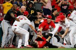 CINCINNATI (AP) – Clint Hurdle and David Bell had little interaction while exchanging lineup cards one day after their teams fought on the field, and the Pirates and Reds were on good behavior Wednesday during Cincinnati’s 4-1 victory over Pittsburgh behind a strong performance from Luis Castillo. Bell and three Reds, including now-traded Yasiel Puig, were ejected for a ninth-inning brawl during the Pirates’ 11-4 win on Tuesday night. Four Pirates also were ejected. Major League Baseball was reviewing video of the fight Wednesday and was expected to hand down suspensions over the second fracas between the NL Central rivals this season. Bell went after Hurdle during the fight and was restrained in a headlock by batting coach Rick Eckstein. Bell repeatedly cursed Hurdle as he left the field. A day later, the two managers didn’t say much while handing lineup cards to the umpires. They’re not done with each other. They meet again at PNC Park on Aug. 23, and wrap up the season together with three games in Pittsburgh Sept. 27-29. The series matched two teams that have faded from the NL Central race, but only one of them is already looking to next year. Puig went to Cleveland as part of a three-team deal for pitcher Trevor Bauer even though Cincinnati had slid to 7 1/2 games out. Puig can be a free agent at the end of the season, while Bauer is under contract control for another year. The Reds also dealt starter Tanner Roark to Oakland on Wednesday for an outfield prospect. The Pirates have gone 3-16 since the All-Star break, prompting them to deal starter Jordan Lyles to Milwaukee at the start of the series. They couldn’t muster much against Castillo (10-4), who recovered from his worst start of the season. The All-Star allowed a career-high six runs in a 12-2 loss to the Rockies on Friday. Castillo gave up six hits and a run while pitching into the eighth inning on Wednesday. Raisel Iglesias retired the side in the ninth for his 20th save in 23 chances. Jesse Winker and Eugenio Suarez homered off rookie Dario Agrazal (2-2), who lasted only 3 2/3 innings. Agrazal hit Tucker Barnhart on the foot with a breaking ball, and got Winker on the arm with a fastball, drawing boos from the crowd of 20,886. The umpires huddled after Winker was hit, but didn’t eject Agrazal.