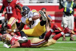 SANTA CLARA, Calif. (AP) – Jimmy Garoppolo threw a 5-yard touchdown pass to Dante Pettis with 1:15 remaining and the San Francisco 49ers overcame five turnovers to beat the Pittsburgh Steelers 24-20 on Sunday for their first 3-0 start in 21 years. The Niners gave the ball away four times in the first half and then lost a fumble again in the fourth quarter, but still managed to pull out the victory and spoil Mason Rudolph’s first career start in place of the injured Ben Roethlisberger for the Steelers (0-3). Rudolph threw two long touchdown passes in the second half, connecting on a 76-yarder to JuJu Smith-Schuster and a 39-yarder to Diontae Johnson that gave the Steelers a 20-17 lead in the fourth quarter. The Niners answered the first strike with a 75-yard touchdown drive capped by a 4-yard run by Jeff Wilson Jr. and appeared poised to do the same when they drove inside the 10 following the second score. But on third down from the 7, a shotgun snap hit receiver Richie James Jr. as he went in motion and T.J. Watt recovered the fumble for Pittsburgh on San Francisco’s third red-zone turnover of the game. The Steelers then gave it right back when James Conner was stripped by Arik Armstead and DeForest Buckner recovered at the 24. After a third-down holding penalty on Mark Barron extended the drive, Garoppolo found Pettis for the go-ahead score. Pittsburgh was unable to generate a first down on the ensuing drive with Rudolph taking a sack on third down and throwing an incompletion on fourth to send the Steelers to their second 0-3 start since 2000. Garoppolo finished 22 for 32 for 277 yards. He threw two interceptions on the first three drives on passes that hit his receivers’ hands and also lost a fumble on a bad snap from center by Weston Richburg with the Niners inside the Pittsburgh 10. Rudolph finished 14 for 27 for 174 yards, throwing an interception to K’Waun Williams on the opening drive of the second half to set up Wilson’s first touchdown.