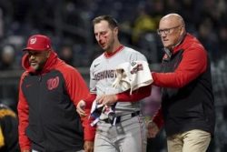 PITTSBURGH (AP) — Washington Nationals third baseman Paul DeJong was hit in the face by a pitch from Pittsburgh Pirates right-hander Mitch Keller on Tuesday night and left the game in the sixth inning. The pitch struck DeJong on his left cheek. After being attended to by athletic trainers, DeJong walked off the field. Amed Rosario pinch ran for DeJong with the Nationals leading 1-0. DeJong was 0 for 2 and is hitting .204 in 16 games this season. He signed with the Nationals as a free agent during spring training after hitting 24 home runs with the Chicago White Sox and Kansas City last season.