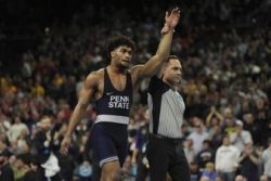 PHILADELPHIA (AP) — Penn State’s Carter Starocci won an unprecedented fifth national title and Oklahoma State’s Wyatt Hendrickson stunned Olympic gold medalist Gable Steveson 5-4 in the heavyweight final at the NCAA men’s wrestling championships with President Donald Trump in attendance. Hendrickson, the transfer from Air Force, trailed in the last match of the evening until scoring on a takedown in the final minute — the only takedown Steveson allowed all season. Penn State claimed its third four-peat, running away from the field to claim its 12th men’s Division I men’s wrestling national title under coach Cael Sanderson. Nebraska finished second and Oklahoma State was third.