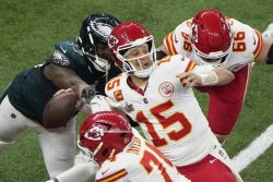 NEW ORLEANS (AP) — Cooper DeJean, Josh Sweat and the Philadelphia Eagles’ ferocious defense denied Patrick Mahomes, Travis Kelce and the Kansas City Chiefs a Super Bowl three-peat. It wasn’t even close. DeJean got a pick-6 on his 22nd birthday, Sweat tormented Mahomes and the Eagles routed the Chiefs 40-22 on Sunday to secure the franchise’s second Super Bowl championship. Jalen Hurts threw for two touchdowns and ran for a score on a tush push, and Vic Fangio’s defense was so dominant that the Eagles didn’t need much from Saquon Barkley. With Donald Trump becoming the first president in office to attend a Super Bowl, the Eagles outplayed Kansas City in every facet.