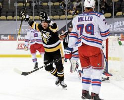 PITTSBURGH (AP) – Sidney Crosby capped Pittsburgh’s three-goal outburst in the first period, and the Penguins beat the New York Rangers 5-1. Crosby scored his eighth of the season, Kasperi Kapanen netted his sixth and John Marino his first as Pittsburgh scored three times on six shots. Evgeni Malkin and Zach Aston-Reese scored in the third period as the Penguins won for the ninth time 13 games. Casey DeSmith had 22 saves in his second start since Feb. 11. Mika Zibanejad scored the Rangers, who had their season-best three-game winning streak halted.