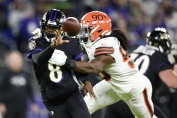 BALTIMORE (AP) – Lamar Jackson provided one brilliant highlight during an otherwise subpar performance and his 13-yard touchdown pass to Mark Andrews in the third quarter was enough to lift the Baltimore Ravens to a 16-10 victory over the Cleveland Browns. Jackson threw a career-high four interceptions but the only Baltimore touchdown was a memorable one. Jackson scrambled all the way back to about the 35-yard line before lofting a pass over the middle to a remarkably open Andrews in the end zone. That made it 13-3 and the Ravens held on. Cleveland never could get its top-ranked running game going.