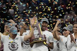 MINNEAPOLIS (AP) – Destanni Henderson scored a career-high 26 points to lead South Carolina to a 64-49 victory over UConn in the national championship game. On a night when the Gamecocks’ height advantage helped them dominate the game inside, the smallest player on the court did the most damage on the scoreboard. Henderson shot 9 of 20 from the field as the Gamecocks won their second national title. She added four assists and helped hold Paige Bueckers to 14 points, teaming with junior Brea Beal to keep the UConn star in check most of the night.